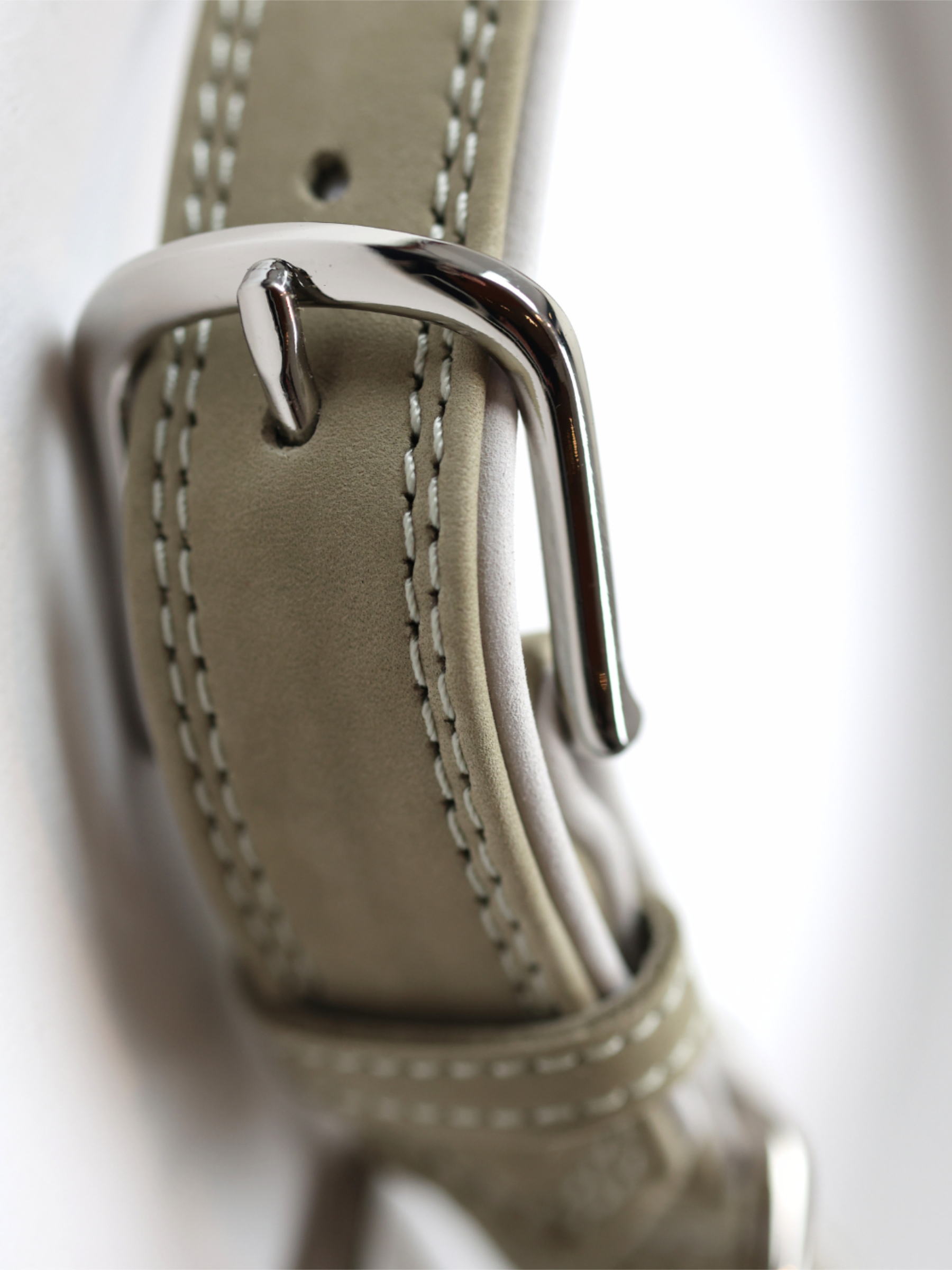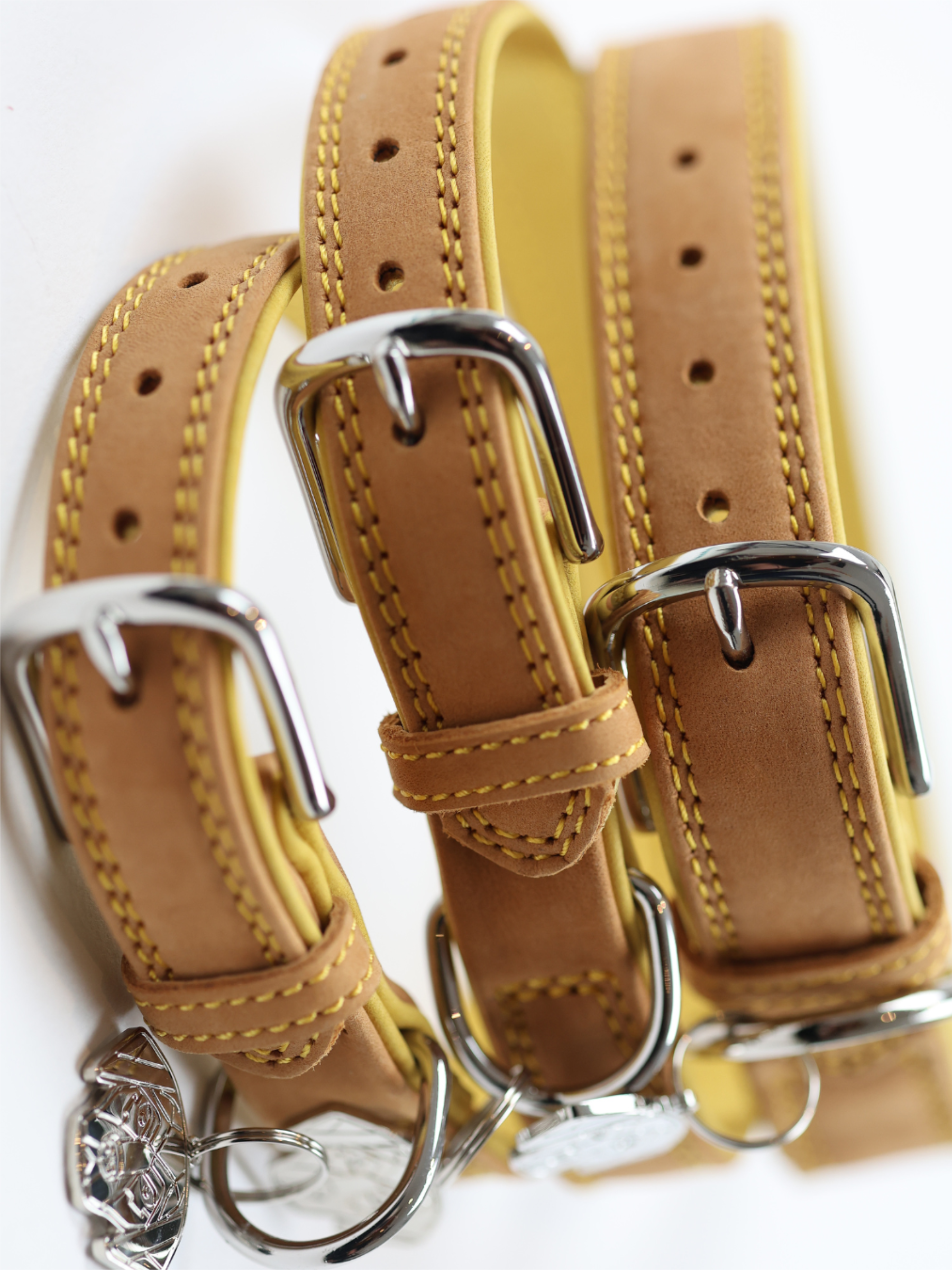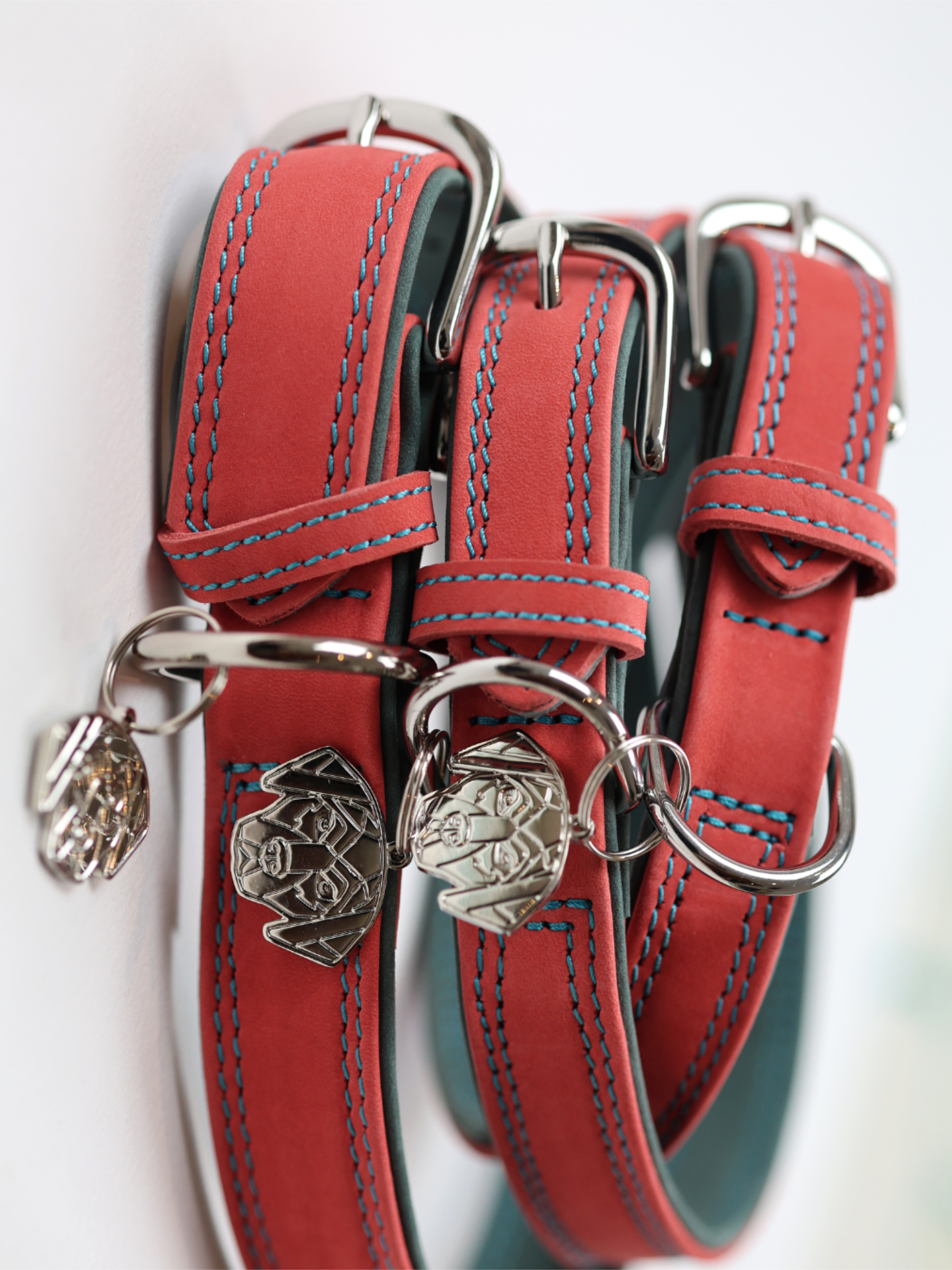 The suede exterior can be wiped clean after use, though care should be taken around water. Like all suede, the dyed finish may leach if soaked, so allowing the collar to air dry and conditioning occasionally will help preserve its character and longevity.