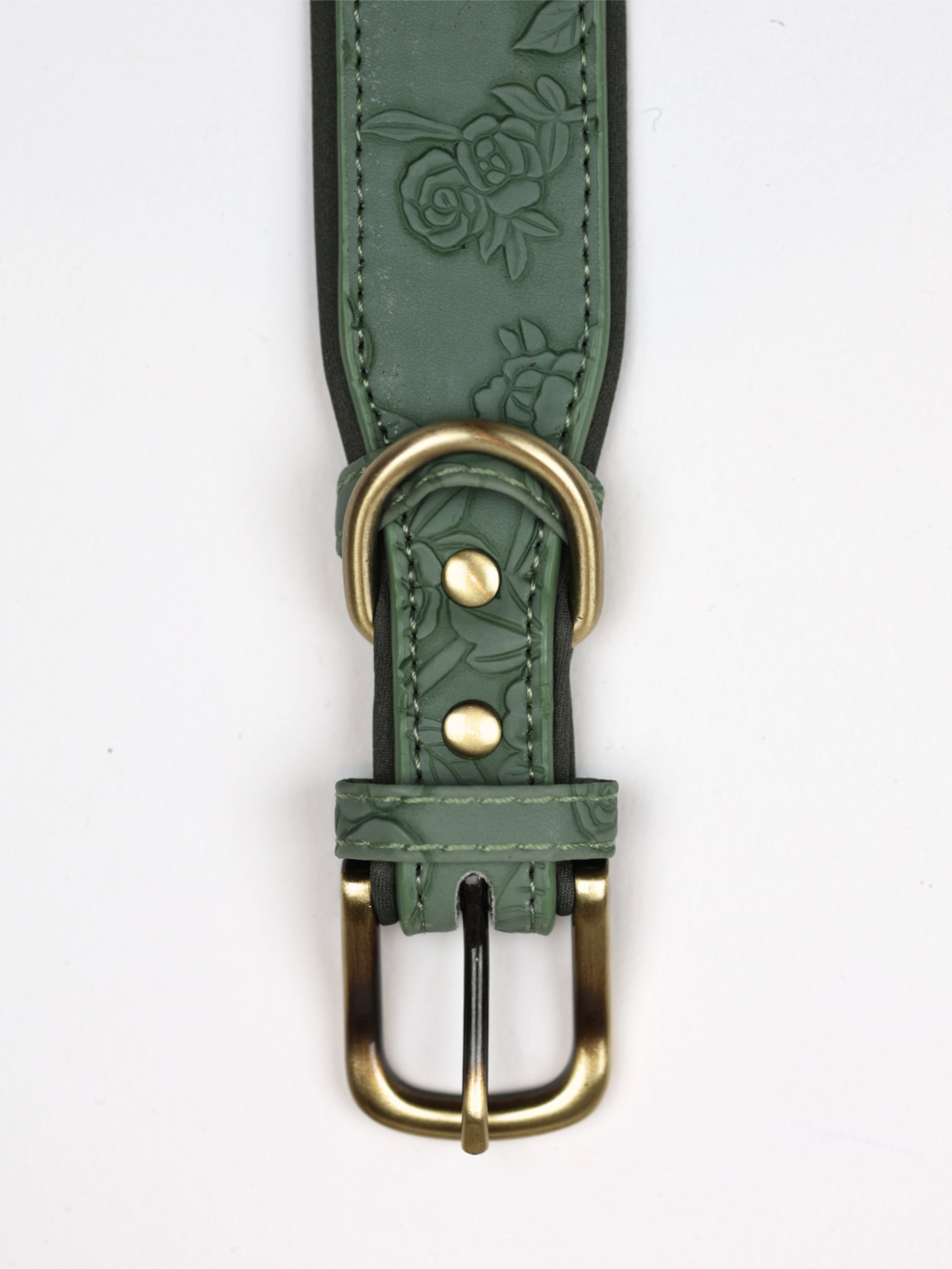 A soft neoprene lining sits against the neck, providing cushioned comfort, reducing rubbing, and protecting the coat during long or active walks. The look is completed with brushed brass hardware, adding a warm, vintage tone reminiscent of classic western tack while offering reliable strength for everyday use.